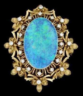 Large black opal, approximately 55 carats, framed by diamond set floral foliate frame, in a convertible ring to pendant setting.