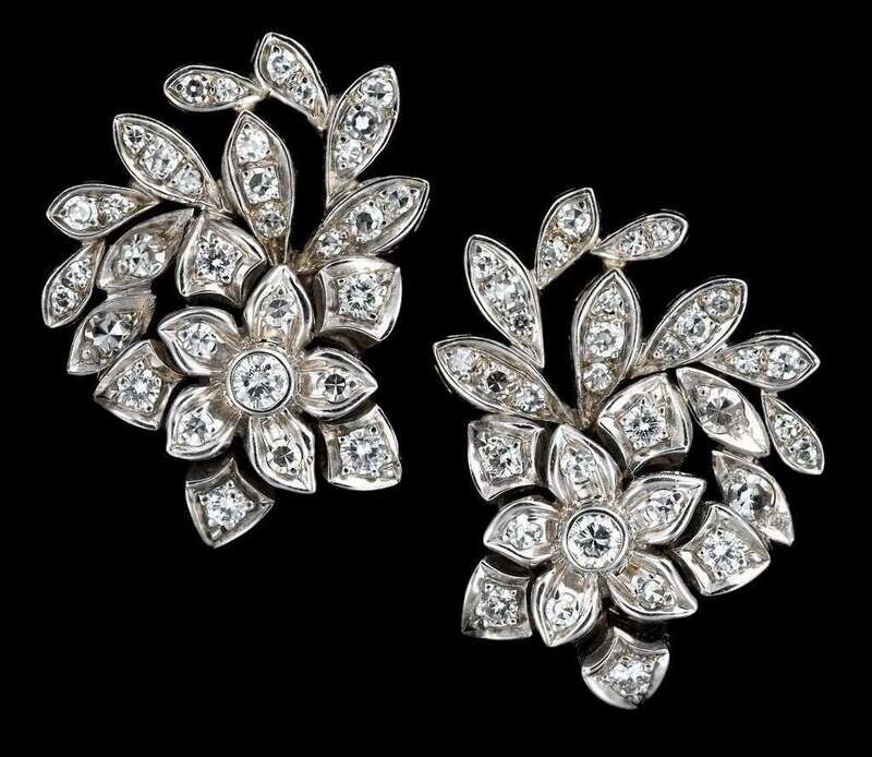 Displays twenty-nine pave and bezel set petite round cut diamonds in foliate motif setting.