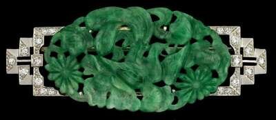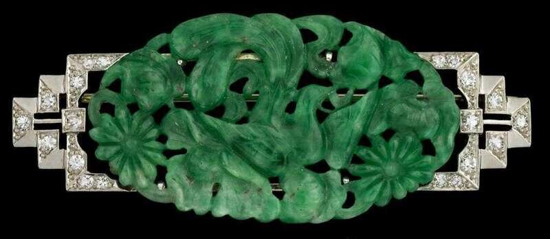 14 karat white gold, jade and diamond brooch