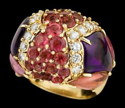 Twenty-five round cut pink sapphires framed on either side by a band of seven round cut diamonds, one cabochon amethyst and two cabochon pink sapphires.