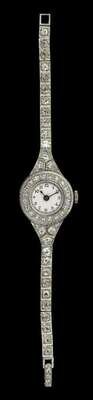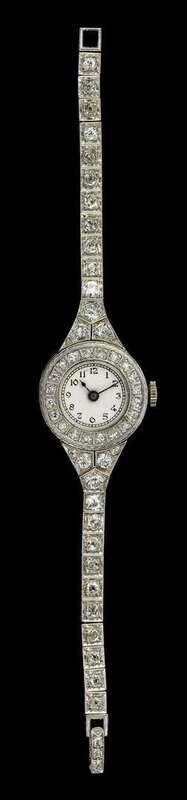 Circular case, silver tone face with Arabic numeral and dash dial, mechanical movement signed by Alstater Watch Co., case no. 27, diamonds surround bezel and wrist band. Total diamond weight approximately 2 carats.