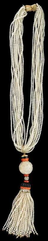 Twelve strand cultured pearl necklace, each pearl 2.7mm, accented by an oversized coral and onyx pearl tassel with carved white jade ball in center.
