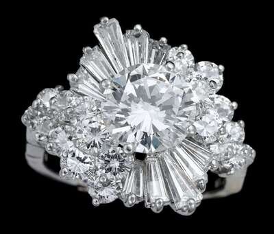 Central round brilliant diamond approximately 2.25 carats surrounded by ten tapering baguette diamonds and twenty round cut diamonds in traditional ballerina setting.