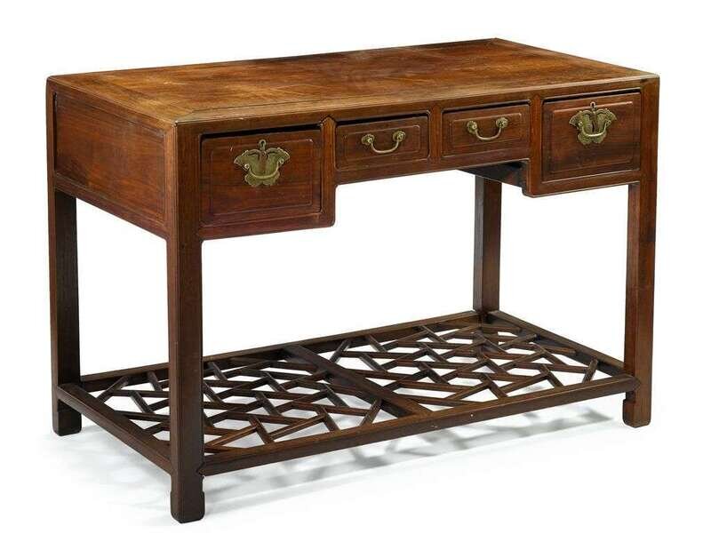 The rectangular top over four drawers to the frieze, raised on ice-flake lattice platform, terminating on short square feet.