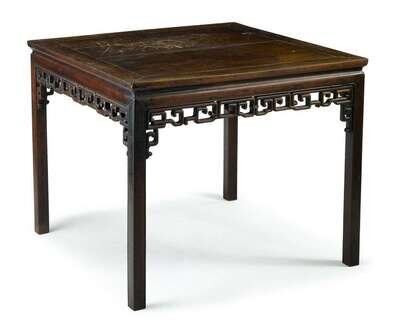 With a square top above a lattice-scroll carved apron, raised on tall square legs.