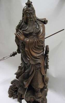 The large and imposing figure stands in warrior's attire with a sword at his side and holding a guandao in his right hand; with inlaid eyes and highlights.
