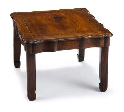 The shaped square top over plain high apron raised on straight square legs, terminating on carved hoof feet.