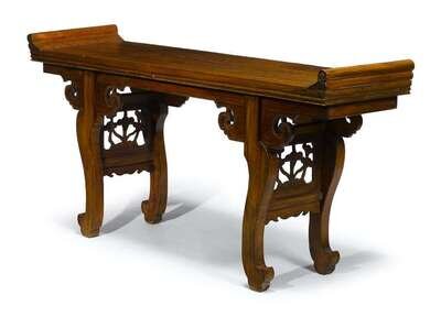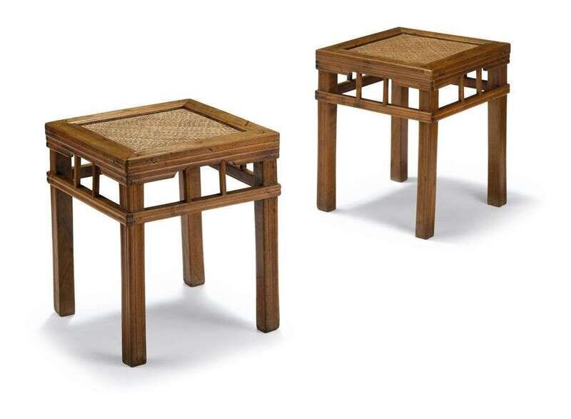 Chinese yumu recessed leg side table and pair of carved nanmu and caned simulated bamboo stools 18th century