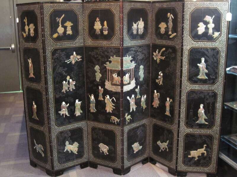 Chinese jade, soapstone, ivory, polychrome and mother-of-pearl inlaid lacquered floor screen late 19th century