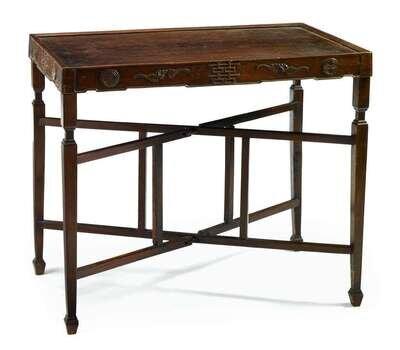 Two parts, the rectangular tray with gallery, over base with folding square tapering legs; together with two hongmu stools. (3).