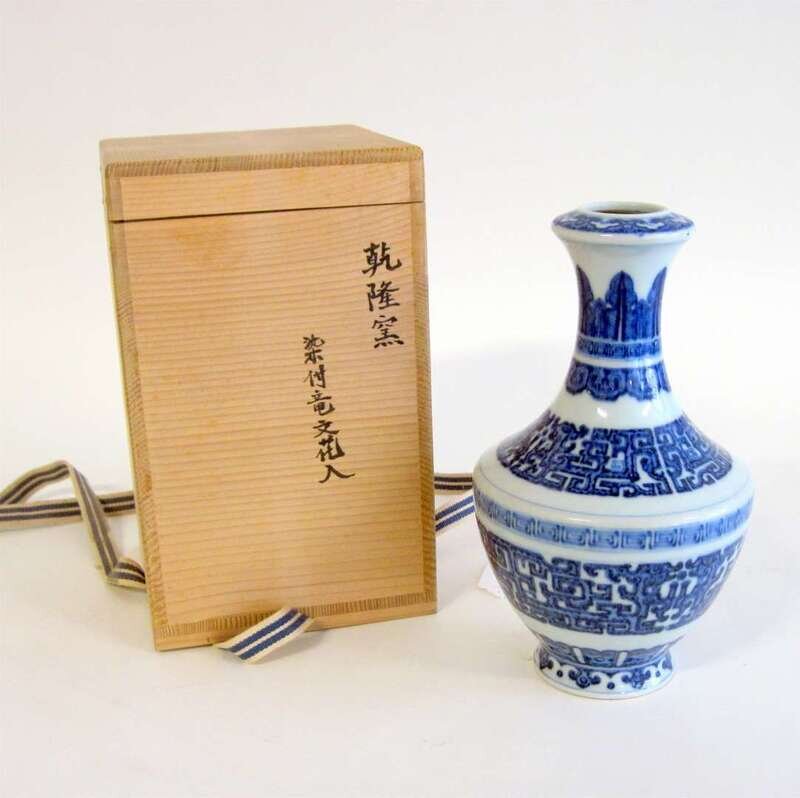 Of bottle form, with garlic head, underglazed with archaic scrolls, mark to base, old Japanese collectors box.