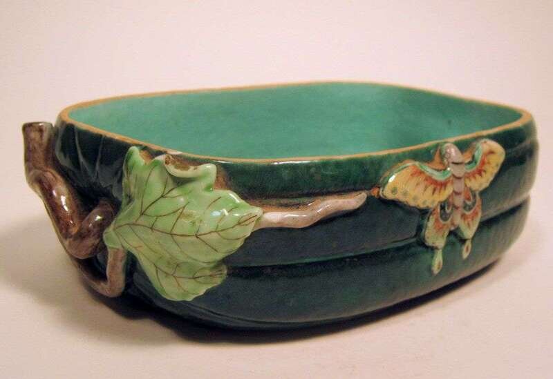 Of melon form, applied with butterflies and stems to green glazed body below gilded rim.