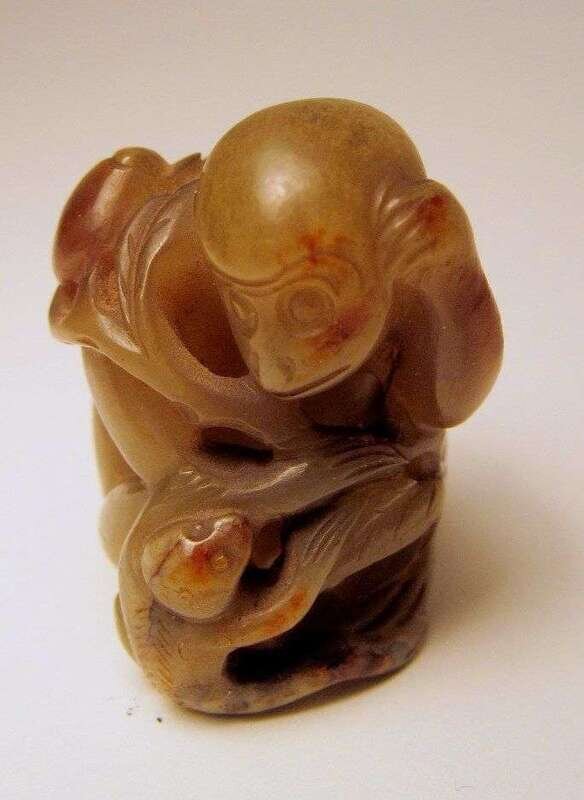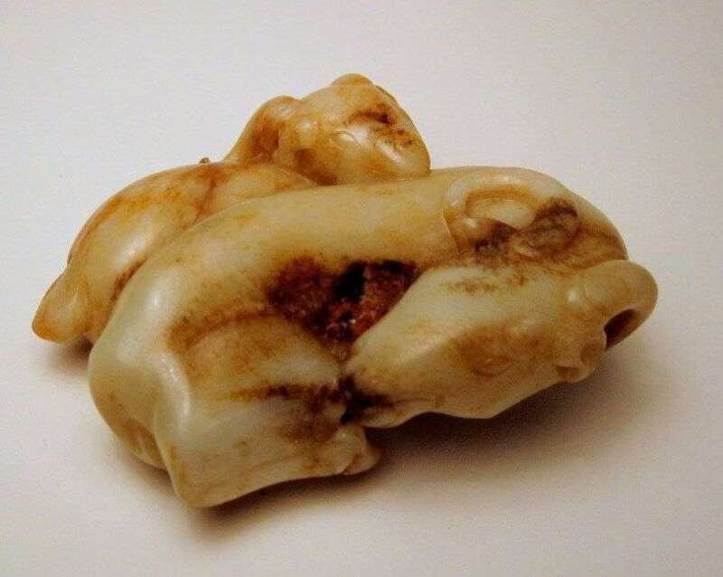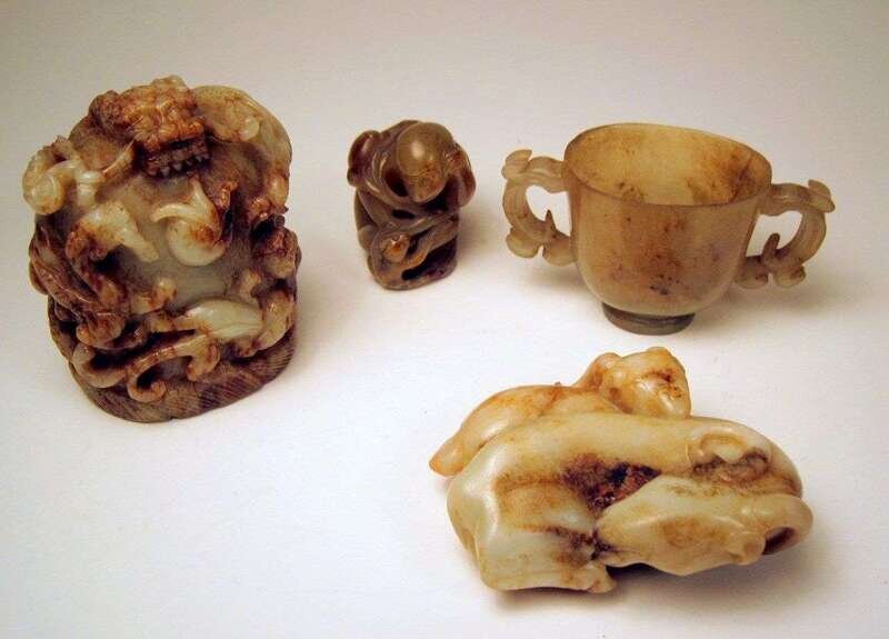 Comprising a large hat finial carved with qilong dragons circling a flaming pearl, a carving of two monkeys with a peach bough, a small twin handled cup and a carving of two recumbent goats (4).