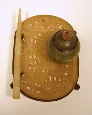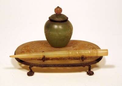 The reticulated oval plaque carved with a figure amidst foliage, supporting a single jade inkwell and a jade stylus, all raised on a gilt metal stand.