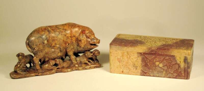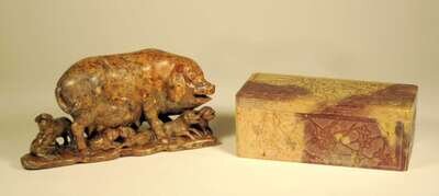 Comprising a rectangular covered box with carved decoration of birds in flowering branches and a boar grouping. (2).