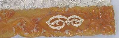 The sticks with pierced and carved decoration of griffins; mounted with an 'E' in gold and diamonds; the lace with a monogram 'LBE'; in a fitted box and pachette.