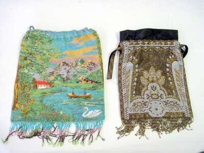 The first with a beaded landscape scene of a house by a pond; the second with a geometric design in browns and golds. (2).