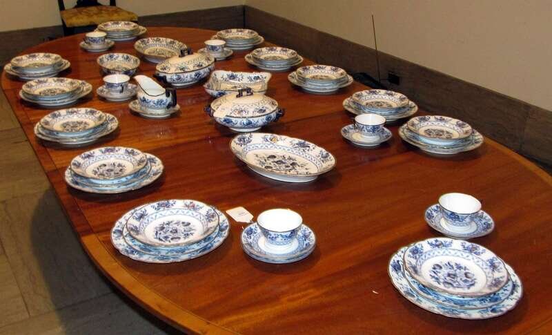 Comprising 12 dinner plates, 12 luncheon plates, 12 soup plates, two covered entree dishes, 1 oval open serving dish, 1 square open serving dish, 2 platters, gravy boat, 6 teacups and 7 saucers; all decorated in the typical pattern. (56).