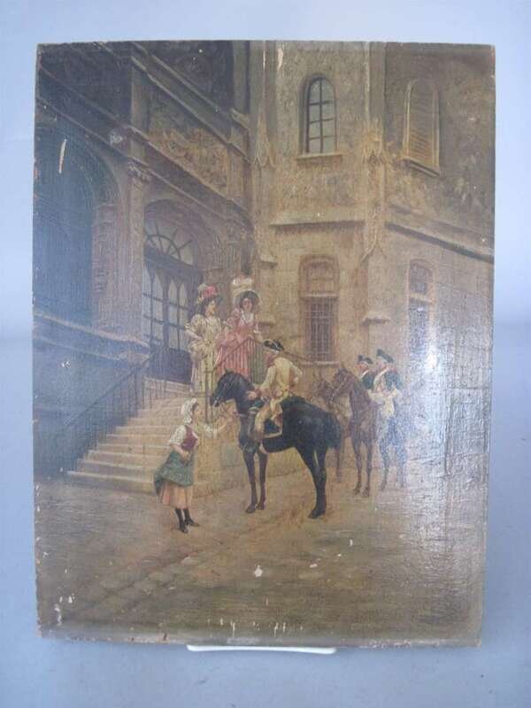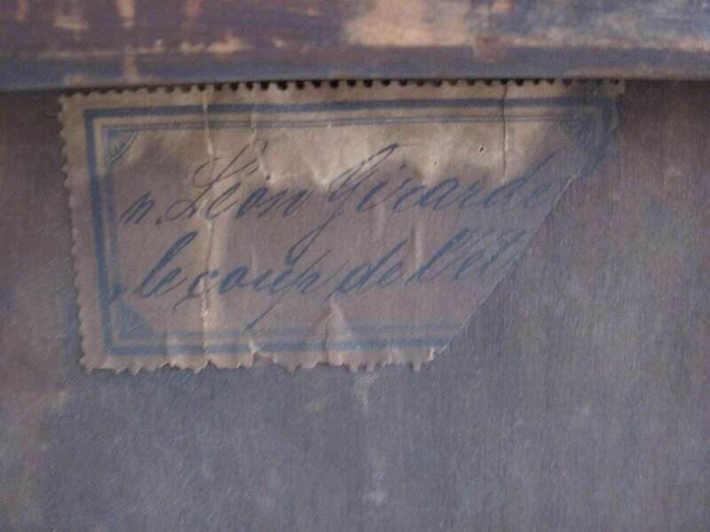 Oil on board, depicting a French street scene, unsigned; paper label on reverse reads 'Leon Girardet / Le Coup de L*'.