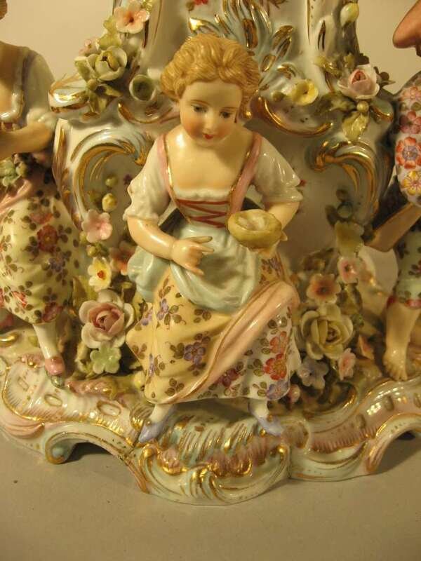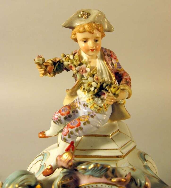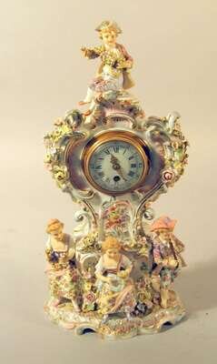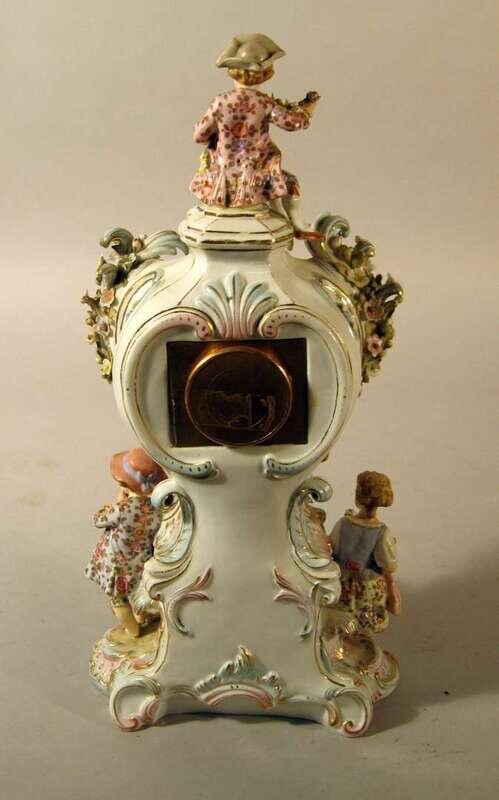 The enameled circular dial with Roman and Arabic numerals set into a porcelain Rococo style case, applied with C-scrolls and blossoms and surmounted by a boy holding a floral garland above two girls and a boy playing the flute.
