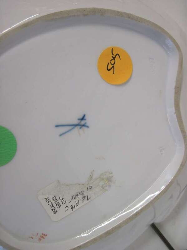 With molded foliate decoration, painted with foliate sprigs; underside with blue crossed swords mark and impressed marks.