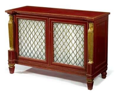 Empire style red painted, parcel gilt and gilt metal mounted side cabinet 19th/20th century
