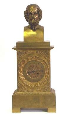 With a foliate cast dial with Roman numerals, set into a foliate cast upright case, surmounted by a bust of Socrates, and raised on a stepped base and bracket feet.