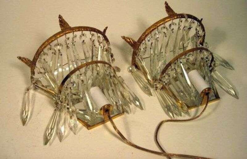 Each with two D-shaped foliate cast rings supporting hanging glass prisms, on a mirrored backplate; electrified. (2).