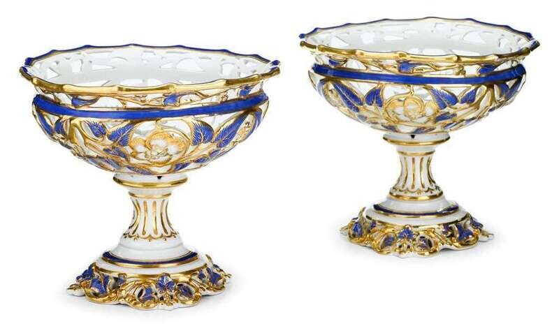 Each with openwork bowl decorated with flowers and leaves in blue and gilt, above short stem terminating in circular base, one numbered 2056 in gilt to underside. (2).
