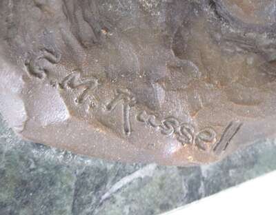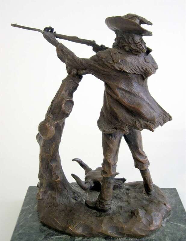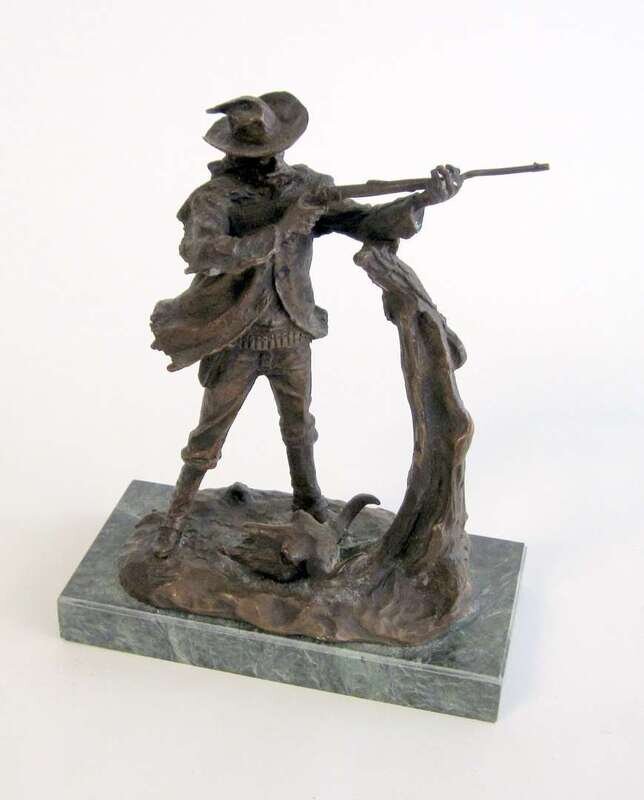 Bronze, medium brown patina, modeled as a frontiersman, standing on a naturalistic base, inscribed 'C.M. Russell".