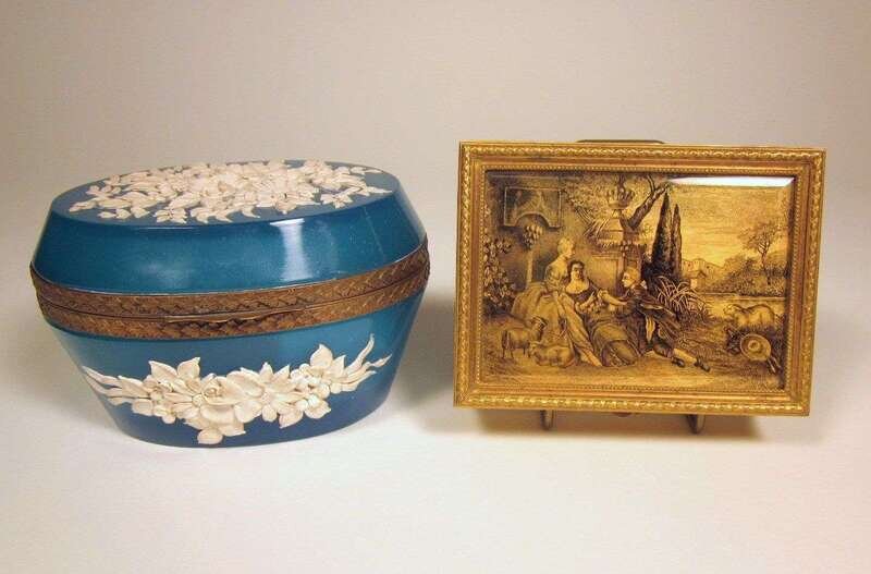 Ovoid form, with gilt metal banding, the lid and front decorated in bisque with foliate sprays; together with a rectangular gilt metal box, with a cover inset with an etched panel depicting eighteenth century figures in a landscape, behind beveled glass. (2).