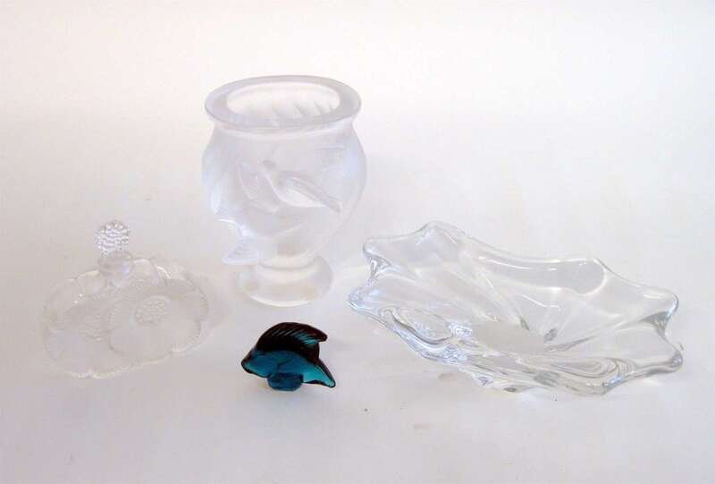 Comprising a 'Deux Fleurs' pattern glass perfume bottle, a small bud vase with raised bird and a blue figure of an Angel Fish; together with Baccarat low free form dish with etched mark. (4).