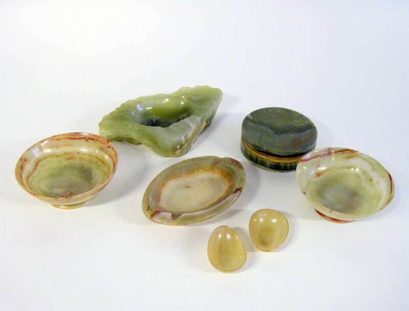 Comprising a hinged circular box, ashtray, two bowls, a free-form bowl and two small oval bowls. (7).