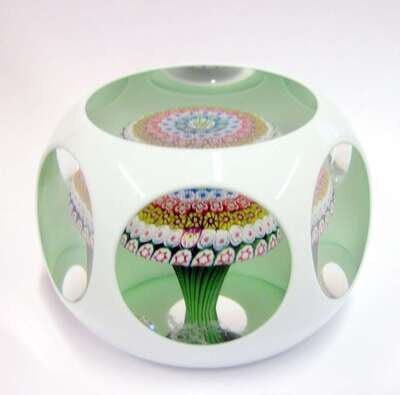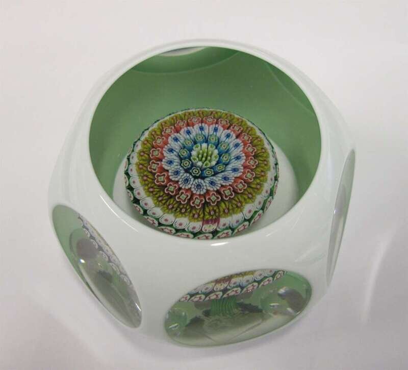 With a central close-packed millefiori mushroom, encased in green glass, with white overlay, with signature and date cane for 1981.