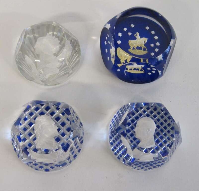 The first commemorating Queen Elizabeth's inauguration, signed and dated 1953; the second commemorating Dwight D. Eisenhower, on a cobalt blue waffle-cut ground, dated 1954 and one depicting Thomas Jefferson, on a cobalt waffle-cut ground, dated 1954; together with a Saint Louis Sulphide, depicting George Washington on horseback, 52/250. (4).
