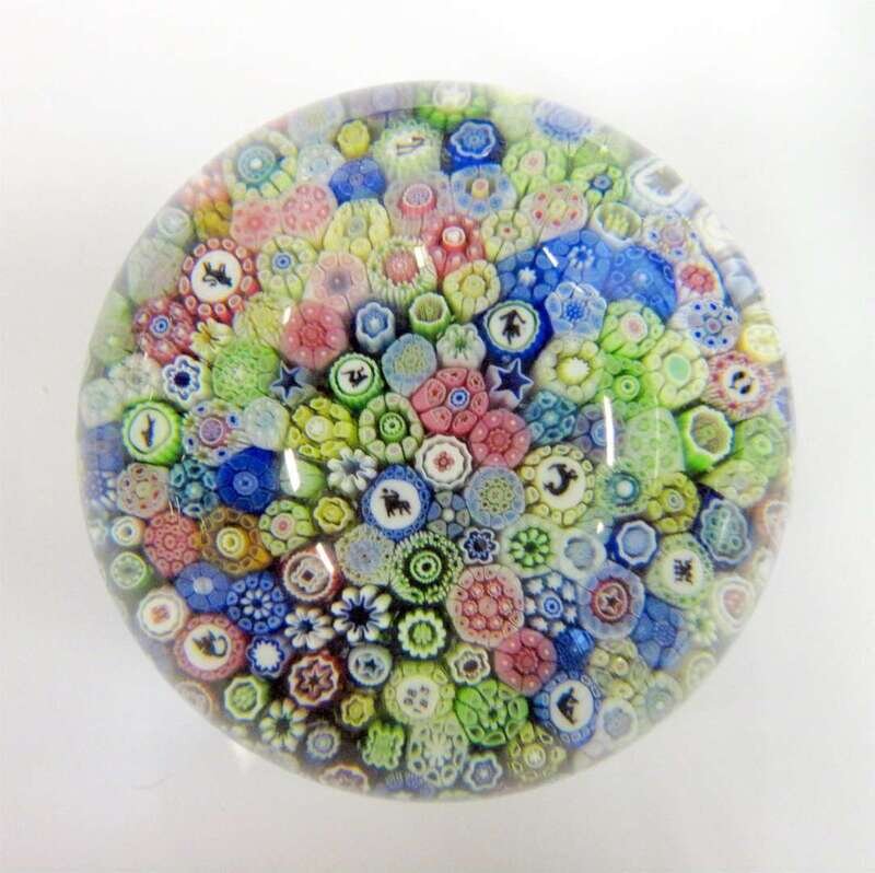 With multipled close packed canes, including zodiac silhouettes and signature and date cane for 1983; underside with stenciled marks.