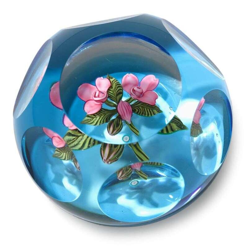 With two pink blossoms, two buds and striped leaves, encased in blue glass, with circular facets, with signature 'P' cane; underside with incised 'JP 1991'.