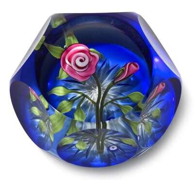 With a rose and bud, issuing from a leafy stem, on a blue ground, with circular facets, with signature 'P' cane; with star cutting to underside.