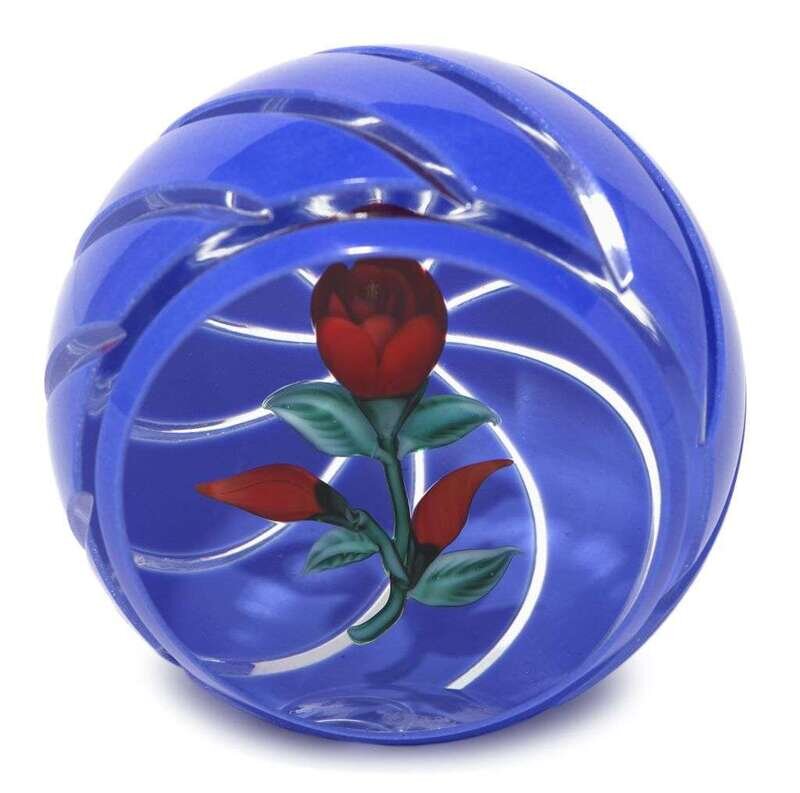 With a blue swirl overlay enclosing a red blossom, buds and leafy stems, with clear window to the side, with etched 'Randall Grubb '88'.