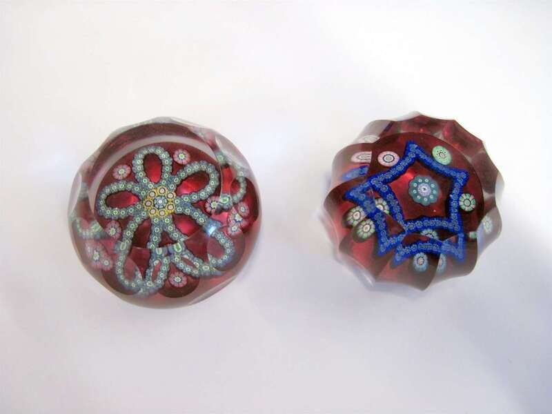 Two Perthshire patterned millefiori ruby flash faceted paperweights one with 'n' cane for 1982, limited to 400 pieces