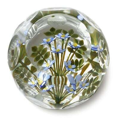 With a bouquet of blue flowers and leaves, with circular facets, on a waffle-cut ground, with signature 'P' cane.