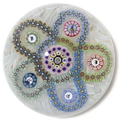 With central complex canes, enclosed by multi-colored garlands, with silhouette canes of a tractor, balloon, bike, ship and bicycle; with date and signature cane.