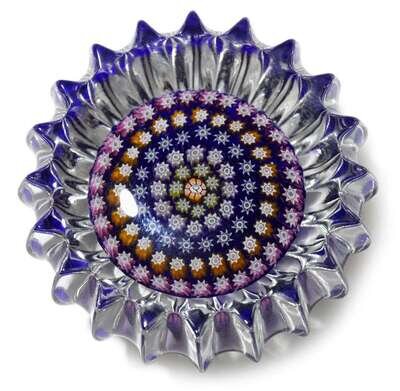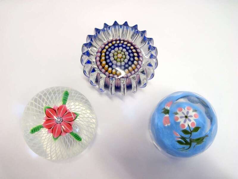 Comprising a fancy cut concentric millefiori paperweight with a central 'P' cane, enclosed by rings of vari-colored canes; within a ribbed cut case; a Perthshire flat primrose weight, dated 2001, limited to an edition of 50 and a red clematis on a latticinio basket, 226/400; each with signature 'P' canes. (3).