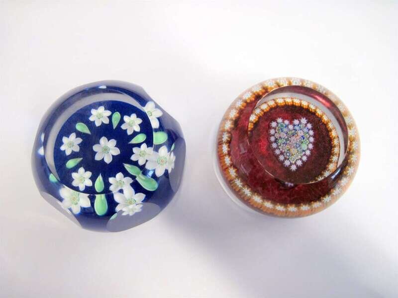 The first with a millefiori heart on a ruby red ground, enclosed by a ring of orange and white canes; the second with white clematis flowers, on a cobalt ground, with circular side facets, with date cane for 1999; both with signature 'P' canes. (2).