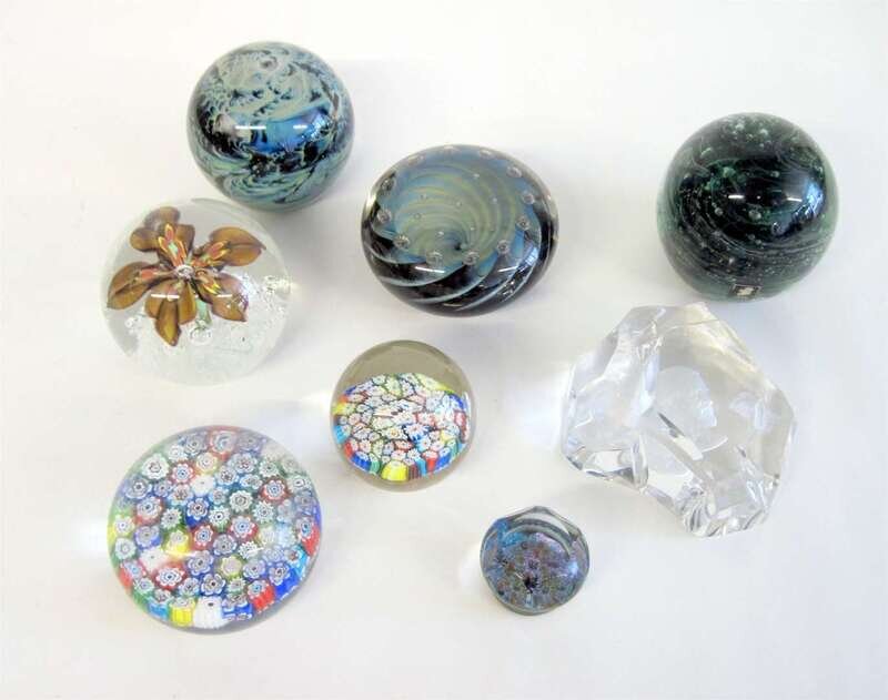 Comprising a Josh Simpson 'Planet' weight, dated 1986; an American flower & bubble weight; two Murano millefiori weights; a Black Sheep Glass weight, dated 1988; Kerry glass weight; a Jesse Taj butterfly weight and a Val St. Lambert free-form weight, depicting General E. Lee. (8).