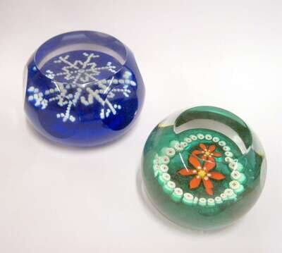 Comprising a snowflake with a central signature and date cane, enclosed by canes forming a snowflake, on a blue ground, underside with incised 73/500 and another with a central poinsettia, enclosed by a cane garland, on a green ground, underside with stencilled marks; both with circular facets. (2).