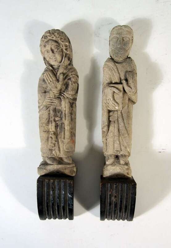 Each carved standing, one holding a book, mounted on carved oak wall brackets. (2).