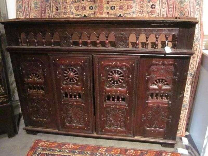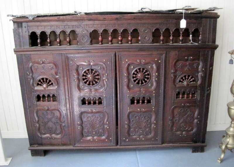 The ogee top over a spindle gallery over frieze with inscription 'F:F:P:N: GERMAIN: GLEVAREC: MARIE MORVAN: AN 1813', above two sliding cupboard doors centered by open roundels composed of baluster turned spindles, opening to shelves, above foliate carved motifs, flanked on either side by similarly worked panels, on stile feet.