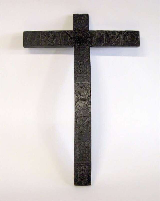 Carved in low relief with INRI flanked by roundrels depicting the sun and moon over foliate sprigs and various farming icons.