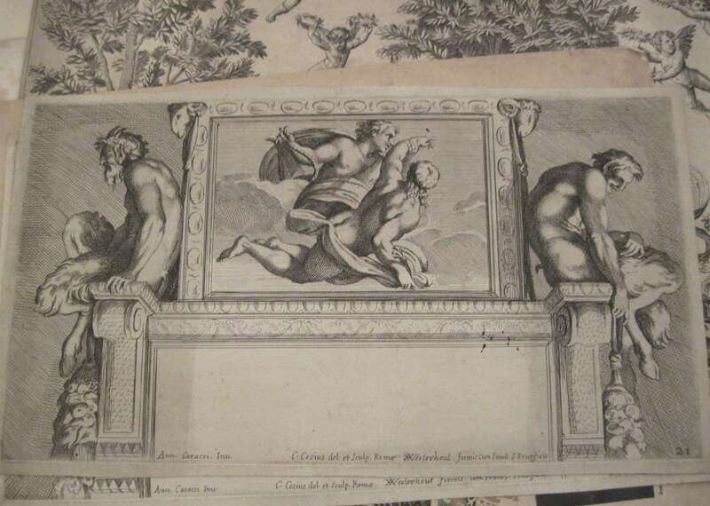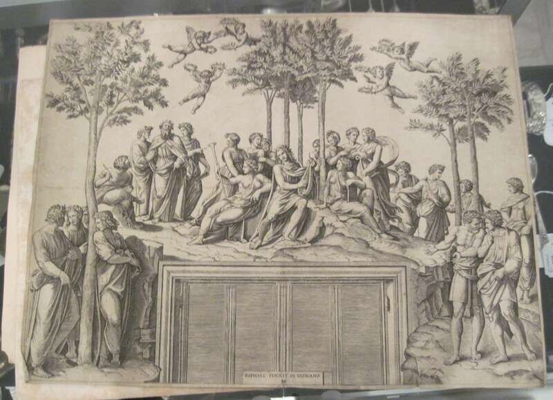 Comprising two etchings 'L'Horoscope Accomplie' and 'Les Epoux Curieux', after Sigmund Freudenberger, printed and published by Nicholas Ponce; two engravings from 'The Grave, a Poem' after William Blake, reengraved by A.L. Dick, mid 19th century; eleven hand coloured engravings of views of Salzburg, after Johann Fischbach, engraved by C. Huber; an engraving by Jules Gabriel Dubois-Menant, "The Old Goat Herder", signed in pencil, lower right, dated 1892; an early engraving depicting a Gameskeeper, engraved by Georg Hertel; an engraving of John Egerton, Bishop of Durham, engraved by JT Wedgwood after the a model in wax by Gaussel; a portrait of Pierre de Gondy after Claude Duflos, engraved by A. Peres (laid down); an engraving of a still life by Alfred Marsaud; an frontispiece from Jacques Necker's, 'Sur le Compte Rendu au Roi", 1781; an engraving of a chateau by Bertha Jaques, signed and inscribed; Two engravings, plates 20 and 21 after Annibale Caracci, after the designs made by Arnold van Westerhout , from "La Galeria nel Palazzo Farnese a Roma... dipinta di Annibale Carracci"; and engraving of Apollo on Parnassus [after engraving by Marcantonio Raimondi (1480-1534) after Raphael Sanzio (1483-1520)], artist monogram 'MAF' in plate, below 'Raphael Pinxit in Vaticano'; 'egraving 'Stacking Hay' by J.E. Howard; an engraving of Blanca Capellia, after Pietro Antonio Pazzi; portrait engraving of M. Aert Van Der Goes after Charles Joseph Flipart; two handcolored engravings of scenes of Hamburg; two engravings of Edwardian women, signed 'Hillen'; with various other etchings and engravings.